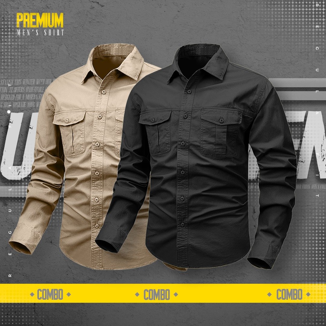 2piece double pocket mens cotton shirt(Black.Khaki)