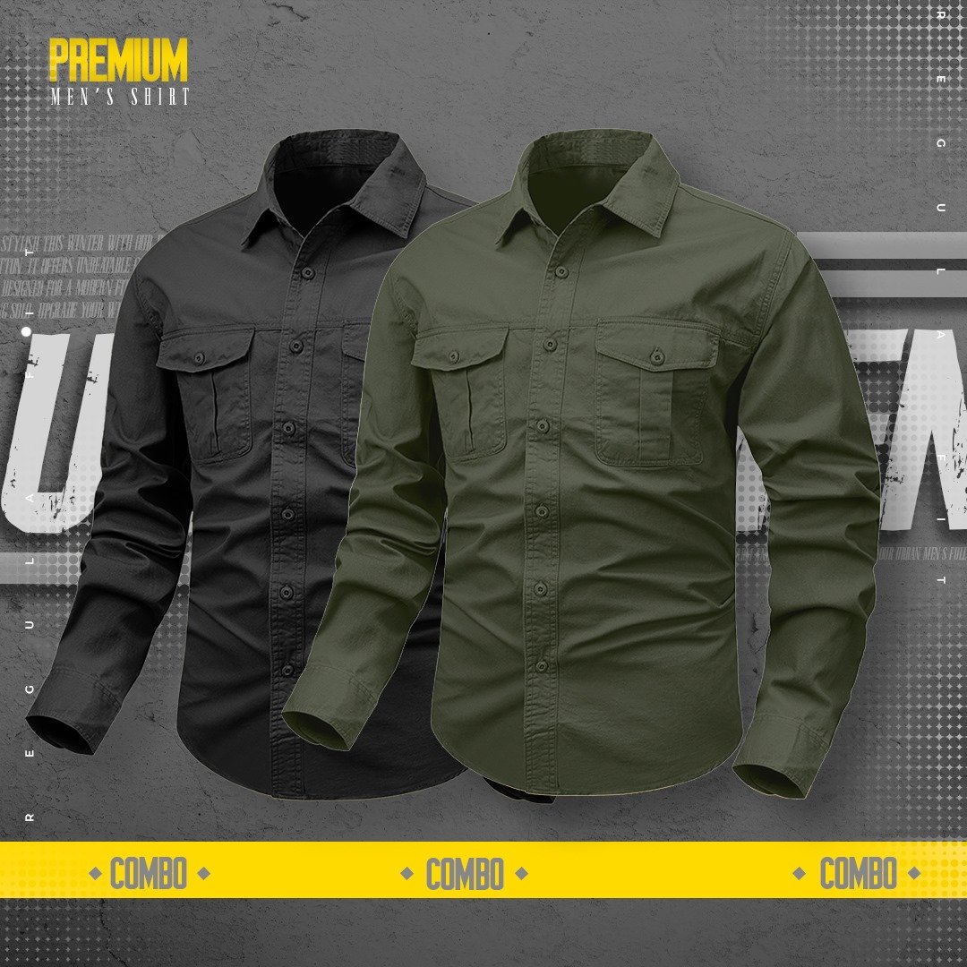 2piece double pocket mens cotton shirt(Black,Olive)