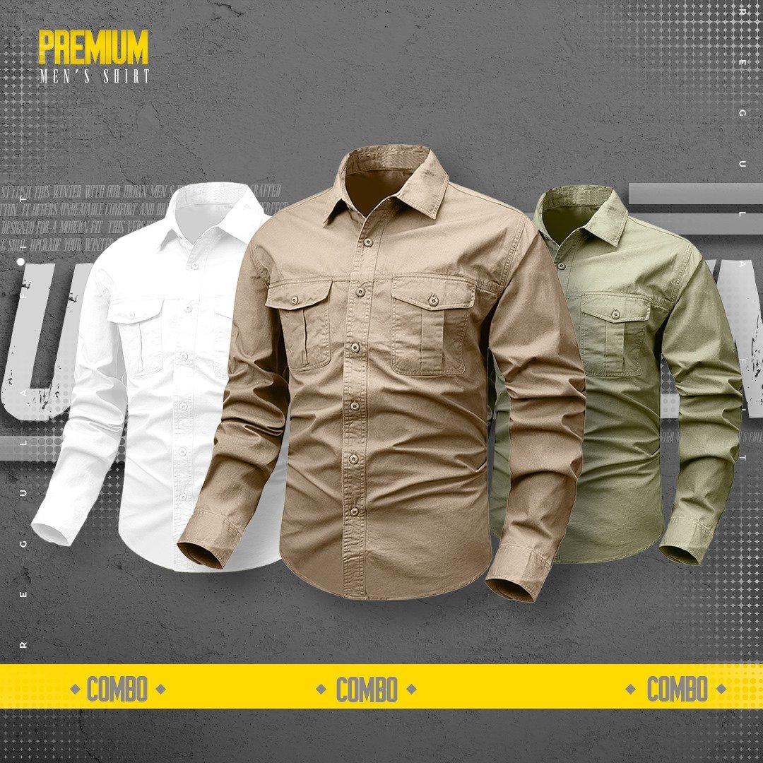 3piece double pocket mens cotton shirt(white,Khaki,Lemon green)